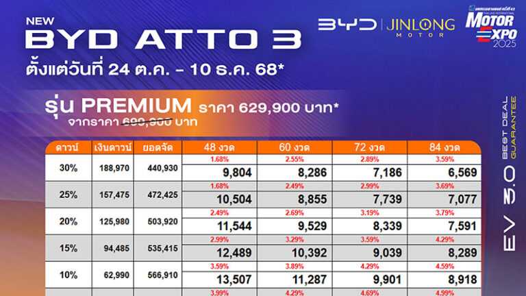 ราคาและตารางผ่อน BYD ATTO 3 ตั้งแต่วันที่ 24 ตค. – 10 ธค. 68