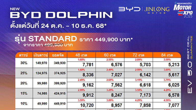 ราคาและตารางผ่อน BYD DOLPHIN ตั้งแต่วันที่ 24 ตค. – 10 ธค. 68