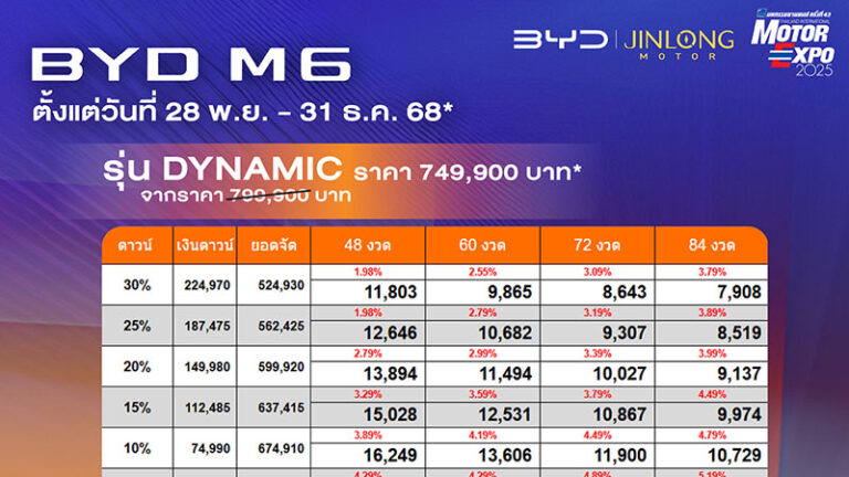 ราคาและตารางผ่อน BYD M6 ตั้งแต่วันที่ 28 พย. – 31 ธค. 68