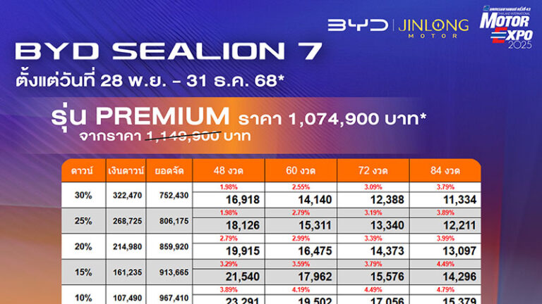 ราคาและตารางผ่อน BYD SEALION 7 ตั้งแต่วันที่ 28 พย. – 31 ธค. 68
