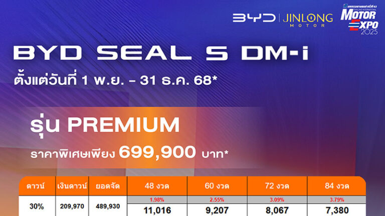 ราคาและตารางผ่อน BYD SEAL 5 DM-i ตั้งแต่วันที่ 1 พย. – 31 ธค. 68 บีวายดี จินหลง สาขานครอินทร์