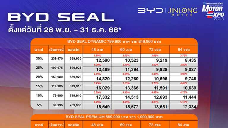 ราคาและตารางผ่อน BYD SEAL ตั้งแต่วันที่ 28 พย. – 31 ธค. 68