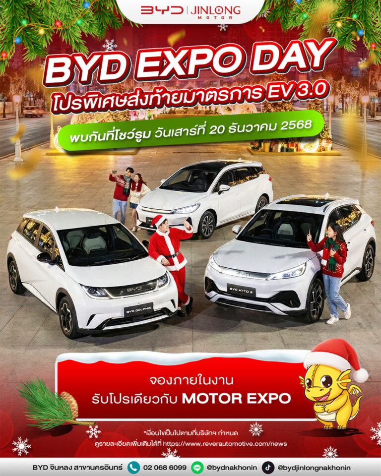 ✨🎄 BYD EXPO DAY โปรพิเศษส่งท้ายมาตรการ EV 3.0 🎄✨ช่วงเวลาพิเศษที่คนรักรถไฟฟ้ารอคอย 🤍 📍 พบกันวันเสาร์ที่ 20 ธันวาคม 2568 ที่โชว์รูม BYD จินหลงมอเตอร์ รับข้อเสนอพิเศษที่ตั้งใจเตรียมไว้ให้คุณ เฉพาะผู้ที่มาร่วมงานเท่านั้น เพราะบางความคุ้มค่า…ต้องมาเจอด้วยตัวเองถึงจะรู้สึกได้จริง🎄 🚘 จองภายในงาน รับโปรเดียวกับ MOTOR EXPO 2025 โปรสุดคุ้มส่งท้ายมาตรการ EV 3.0 เงื่อนไขพิเศษที่ทำให้การมีรถไฟฟ้าเป็นเรื่องใกล้ตัวกว่าที่เคย เพราะการเดินทางที่ดี เริ่มต้นจากรถที่พร้อมดูแลคุณและคนที่คุณรักในทุกเส้นทาง 🌟 วันเดียว โอกาสดีๆ ครั้งเดียว…อย่าปล่อยให้ช่วงเวลาพิเศษผ่านไป โดยไม่ได้แวะมาสร้างจุดเริ่มต้นใหม่ไปด้วยกัน ที่ BYD จินหลงมอเตอร์ 📅 วันเสาร์ที่ 20 ธันวาคม 2568 เท่านั้น!