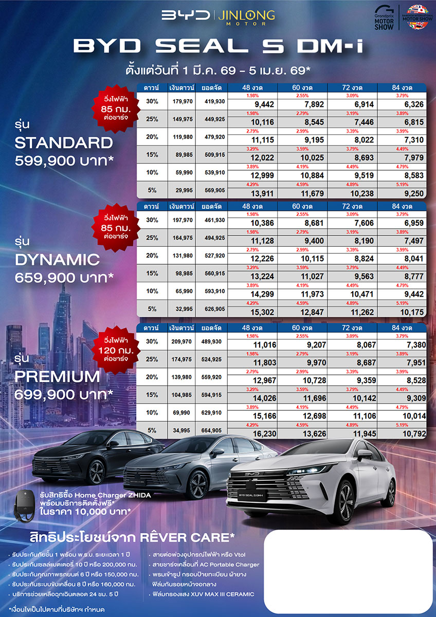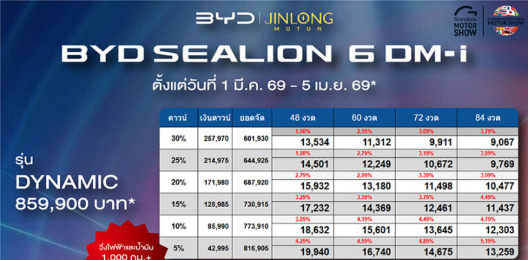 ราคาและตารางผ่อน BYD SEALION 6 DM-i08/03/202608/03/2026ราคาและตารางผ่อน BYD SEALION 6 DM-i ตั้งแต่วันที่ 1 มี.ค. 69 – 5 เม.ย. 69*อ่านเพิ่มเติม
