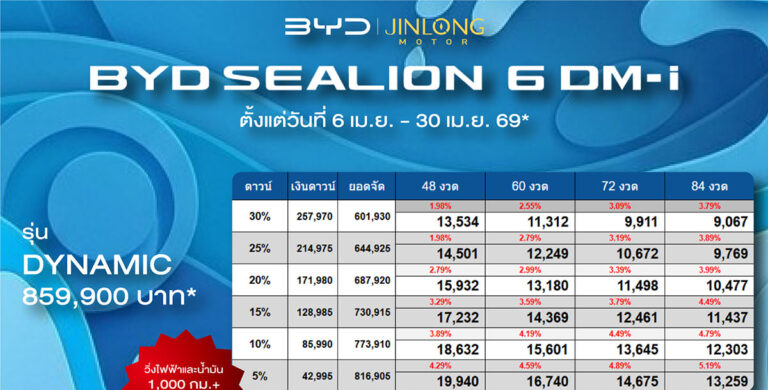 ราคาและตารางผ่อน BYD SEALION 6 DM-i11/04/2026ราคาและตารางผ่อน BYD SEALION 6 DM-i ตั้งแต่วันที่ 6 เม.ย. 69 – 30 เม.ย. 69*อ่านเพิ่มเติม