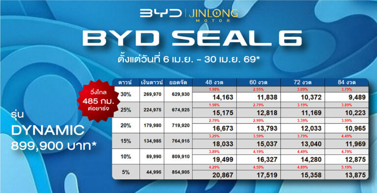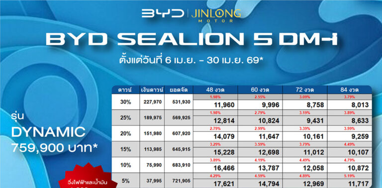 ราคาและตารางผ่อน BYD SEALION 6 DM-i ตั้งแต่วันที่ 6 เม.ย. 69 – 30 เม.ย. 69*