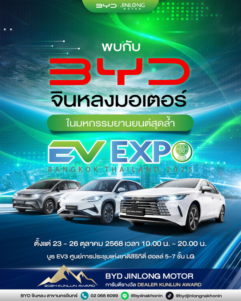 BYD จินหลง มอเตอร์ ขอเชิญชวนทุกท่านสัมผัสเทคโนโลยีสุดล้ำ ในงานมหกรรมยานยนต์สุดล้ำแห่งปี โอกาสสำคัญที่คุณจะได้สัมผัสรถยนต์ไฟฟ้า BYD ครบทุกรุ่น ทั้งรุ่นยอดนิยมและรุ่นใหม่ล่าสุด ที่จะมาพลิกโฉมการเดินทางของคุณให้เป็นมิตรต่อสิ่งแวดล้อมและเปี่ยมด้วยสมรรถนะ!